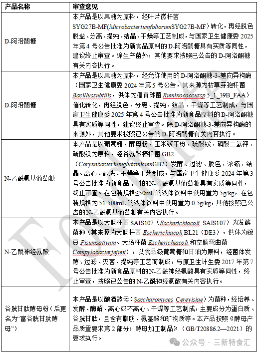 2025年共有13个新食品原料进入终止审查目录,包括D-阿洛酮糖、N-乙酰氨基葡萄糖、N-乙酰神经氨酸、谷胱甘肽酵母粉(后更名为“富谷胱甘肽酵母”)、红枣叶(后更名为枣叶)、梁河滇皂荚、磷虾油、罗汉参、玉米发酵物、吡咯并喹啉醌二钠盐。终止审查意见详情见表4。